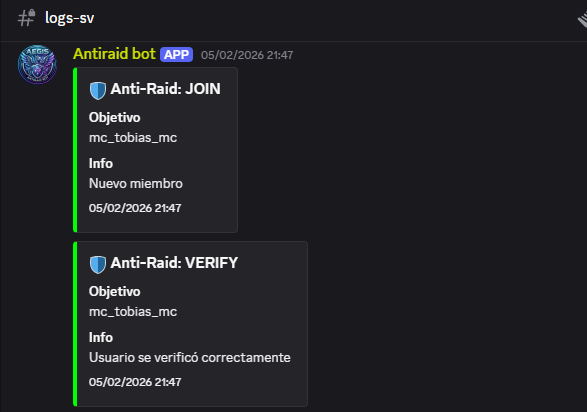 Bot profesional de moderación para Discord con sistema anti-raid, anti-spam y verificación automática. Incluye comandos como ban, kick, mute, warn, purge y lockdown, además de registros detallados de actividad.